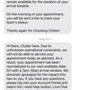 I had an extremely disappointing experience with Clutter. Their communication is absolutely terrible, and it cost me 200 dollars for a service I never received. I scheduled an appointment and was told I would receive a call to confirm details and walk me through the process. That call never happened. I waited, followed up, and even sent an email in advance to cancel because things weren’t clear. Despite all that, I was charged a 200 dollars same-day cancellation fee.