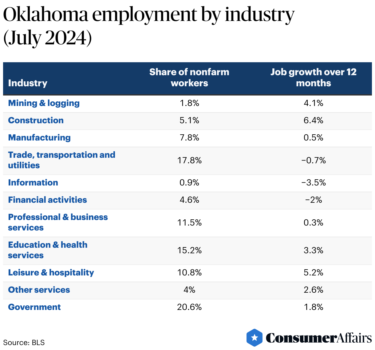 The largest industries in the Sooner State are government, trade, transportation, and utilities, and education and health services. Collectively, these industries employ about 53.6% of nonfarm workers. The fastest-growing industry in the state, however, is construction, growing by 6.4% between July 2023 and July 2024.