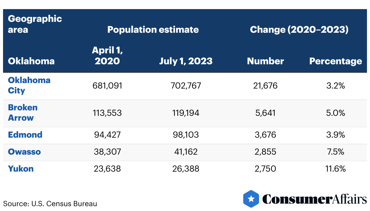 The majority of people moving to the Sooner State are choosing the suburbs surrounding Oklahoma City and Tulsa. Oklahoma City attracted the most new residents, adding 21,676 movers (3.2% growth) between 2020 and 2023. Yukon — a suburb of OKC — saw the highest population growth, growing by 11.6% within that same time period.