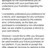 TERRIBLE SERVICE AND EXPERIENCE. DON''T BE TEMPTED TO GET GROUPONS. DELETE THE APP. I bought 3 groupons to the same restaurant, thinking it would be a great deal and perfect for an upcoming special occasion.. but... when I went to make a reservation, the restaurant said they don't take groupons anymore, even though my groupons are not expired or anything yet. They expire on the 31st, it's the 19th now. I contacted customer service and they were absolute robot jerks. They told me to wait up to SEVEN DAYS to remedy. Of which it is not guaranteed they would refund the amount I paid. And I can't use them all at once either even if they did decide to accept them after all.